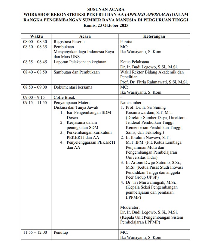 Pada hari Kamis, 23 Oktober 2025 , tepatnya pukul 08.30 WIB – Selesai bertempat di Ruang Indraprasta, UNS Inn , LPPMP UNS mengadakan Kegiatan bertajuk – ” Workshop Rekonstruksi PEKERTI dan AA (Applied Approach) dalam rangka Pengembangan Sumber Daya Manusia di Perguruan Tinggi”.